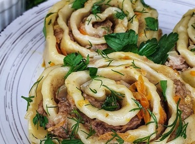 Тесто раскатать в пласт толщиной 3-4 мм. Распределить фарш по тесту равномерным слоем вкрутить в рулет.